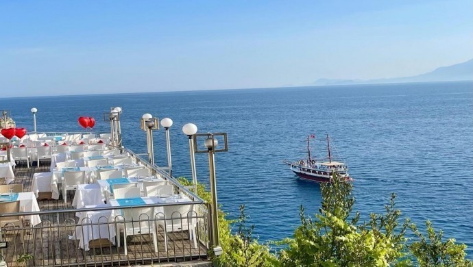 مطعم وكافيه اداليا انطاليا حيث الإطلالة الرائعة على البحر الابيض المتوسط وجبال طوروس,